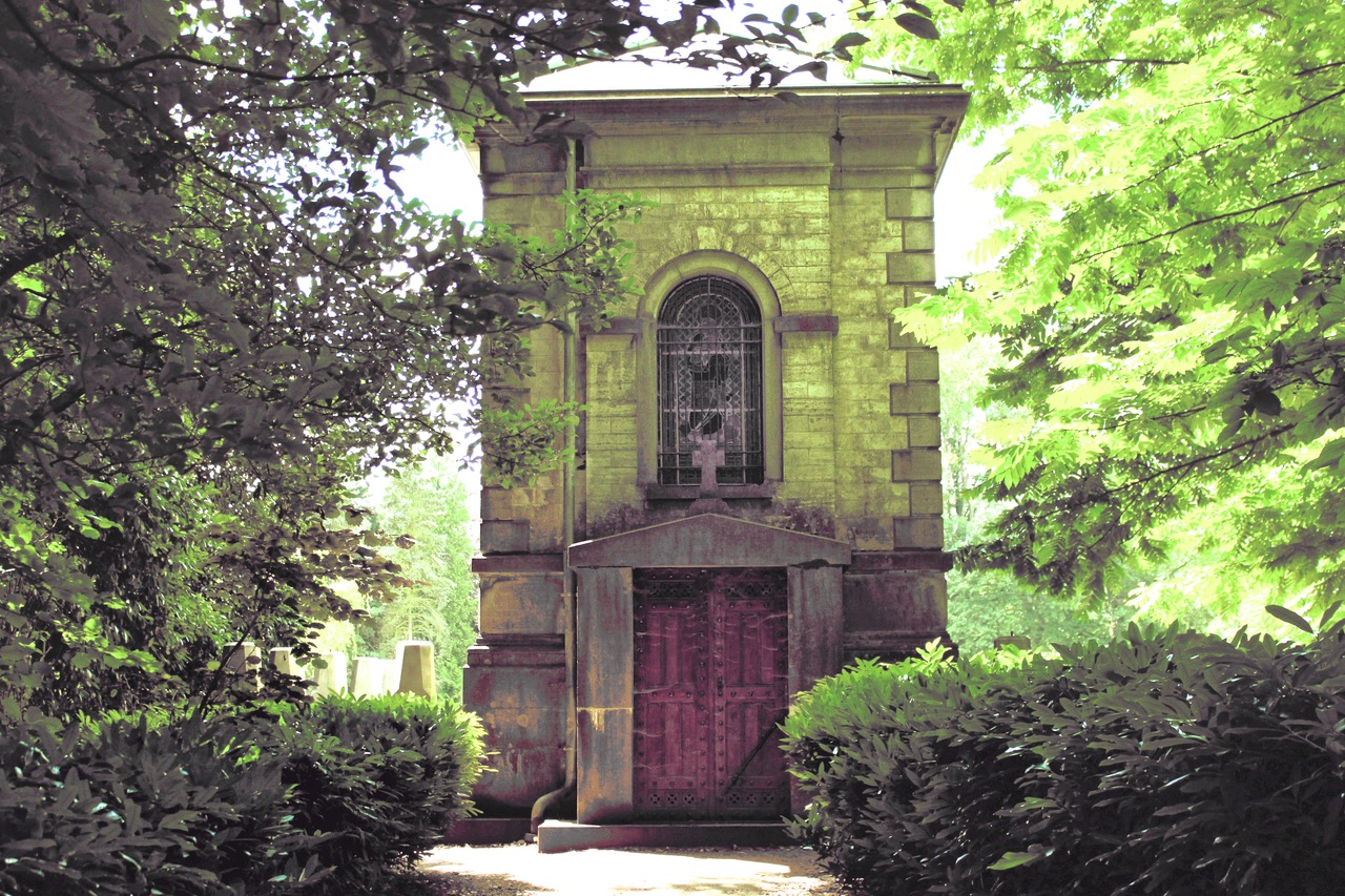 Face à la roseraie le Mausolée ou repose la famille Warocqué